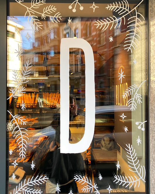 Quelques exemples de vitrines de noël réalisées à la main, à l’aide de peinture blanche, pour la saison d’hiver et de noël 2022.
